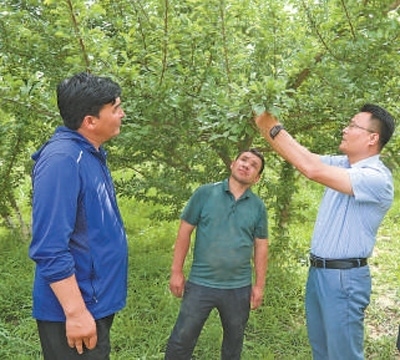 走進(jìn)居民玉素普艾力·達(dá)吾提的果園,徐學(xué)彬正與果農(nóng)交流農(nóng)業(yè)知識:“今年人工授粉,掛果挺好,但還要把防蟲、疏果、施肥放在心上,這才能保證果實的品質(zhì)?!庇袼仄瞻Αみ_(dá)吾提連連點頭,說:“你放心,我記著!”
