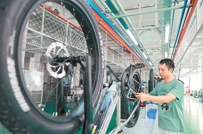 江西省九江經(jīng)濟技術開發(fā)區(qū)九江馳暢車業(yè)有限公司生產(chǎn)車間內(nèi),工人正在組裝銷往歐美市場的新能源助力自行車。魏東升攝(人民視覺)