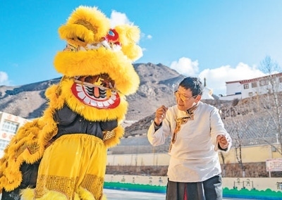 凝聚人心融合了漢藏特色表演形式的碩督鎮(zhèn)獅子舞,見證著西藏各民族交往交流交融的歷史。鄧巴阿尼是西藏昌都市非物質(zhì)文化遺產(chǎn)碩督鎮(zhèn)獅子舞的傳承人,近年來致力于獅子舞傳承。圖為鄧巴阿尼(右)在昌都市洛隆縣碩督鎮(zhèn)小學(xué)指導(dǎo)學(xué)生跳獅子舞。新華社記者 丁增尼達攝