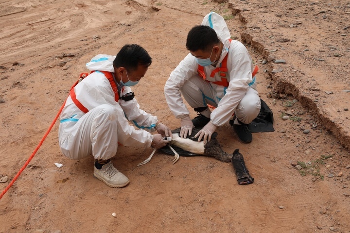 在甘肅張掖黑河濕地國家級自然保護區(qū),單國鋒(左)和同事為一只黑鸛戴上監(jiān)測設(shè)備(資料照片)。新華社發(fā)(甘肅張掖黑河濕地國家級自然保護區(qū)管理局供圖)