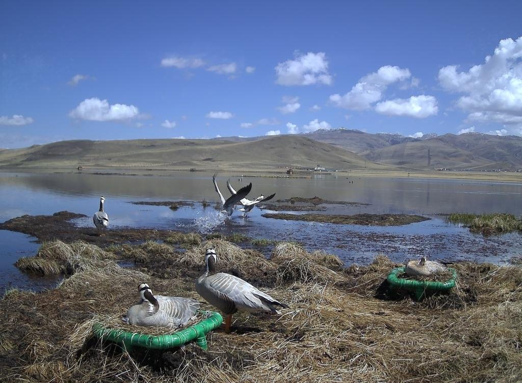 在甘肅尕海則岔國家級自然保護區(qū),棲息的斑頭雁通過人工鳥巢坐巢孵化后代(資料照片)。新華社發(fā)(甘肅尕海則岔國家級自然保護區(qū)管理局供圖)