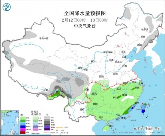 2月12日08時至13日08時,內(nèi)蒙古東北部、東北地區(qū)東部、新疆伊犁河谷和西南部山區(qū)、西藏北部和東部、青海南部、川西高原、江漢西部等地部分地區(qū)有小到中雪或雨夾雪,其中,西藏東部部分地區(qū)有大雪,局地暴雪(10~17毫米)。江南大部、華南大部、西南地區(qū)東部、西藏東南部、海南島、臺灣島等地部分地區(qū)有小到中雨,其中,福建東南部、廣東東部、臺灣島等地部分地區(qū)有大到暴雨(50~70毫米)。內(nèi)蒙古大部、華北北部等地部分地區(qū)有4~6級風(fēng);黃海、巴士海峽等海域有6~7級風(fēng)。