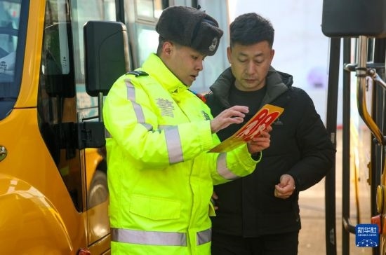 2月14日,烏魯木齊市公安局交警支隊(duì)水磨溝區(qū)大隊(duì)民警檢查校車(chē)通行證。