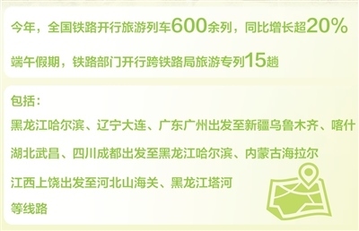 國鐵集團(tuán)數(shù)據(jù)顯示:今年全國鐵路已開行旅游列車600余列,同比增長(zhǎng)超20%。端午假期,鐵路部門開行跨鐵路局旅游專列15趟,包括從黑龍江哈爾濱、遼寧大連、廣東廣州出發(fā)至新疆烏魯木齊、喀什,湖北武昌、四川成都出發(fā)至黑龍江哈爾濱、內(nèi)蒙古海拉爾,江西上饒出發(fā)至河北山海關(guān)、黑龍江塔河等線路。