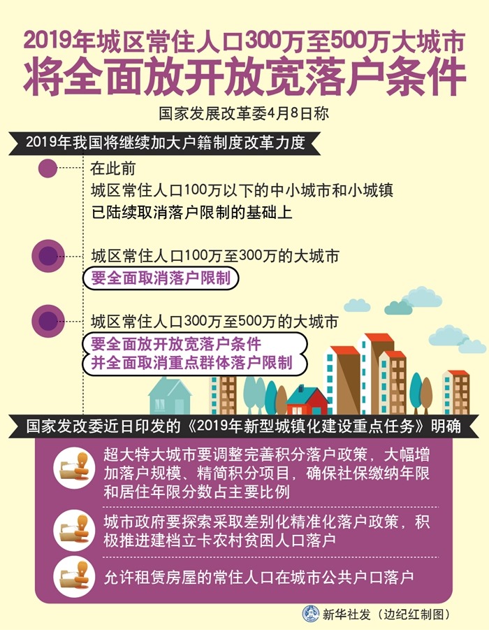 國家發(fā)展改革委8日稱,2019年我國將繼續(xù)加大戶籍制度改革力度,在此前城區(qū)常住人口100萬以下的中小城市和小城鎮(zhèn)已陸續(xù)取消落戶限制的基礎上,城區(qū)常住人口100萬至300萬的大城市要全面取消落戶限制;城區(qū)常住人口300萬至500萬的大城市要全面放開放寬落戶條件,并全面取消重點群體落戶限制。
