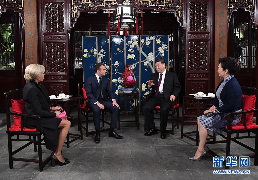 兩國元首夫婦在玉華堂落座。習(xí)近平和彭麗媛愉快地憶及今年3月訪問法國受到馬克龍夫婦熱情款待的情景。習(xí)近平說,歡迎馬克龍總統(tǒng)再次訪華并第一次來上海。上海是中國改革開放和發(fā)展進步的縮影,體現(xiàn)了近代以來中國同世界關(guān)系的演變。希望這次訪問有助于你了解上海、了解中國。我和夫人選擇在豫園款待總統(tǒng)先生和夫人,希望你們能領(lǐng)略中華園林之美和中國的傳統(tǒng)文化。文化藝術(shù)表現(xiàn)形式不同,但帶給不同國家民眾的心靈體驗是相通的,不同文化可以和諧共生。中法作為東西方兩大文明代表,應(yīng)該相互尊重,交流互鑒,各美其美,美美與共。