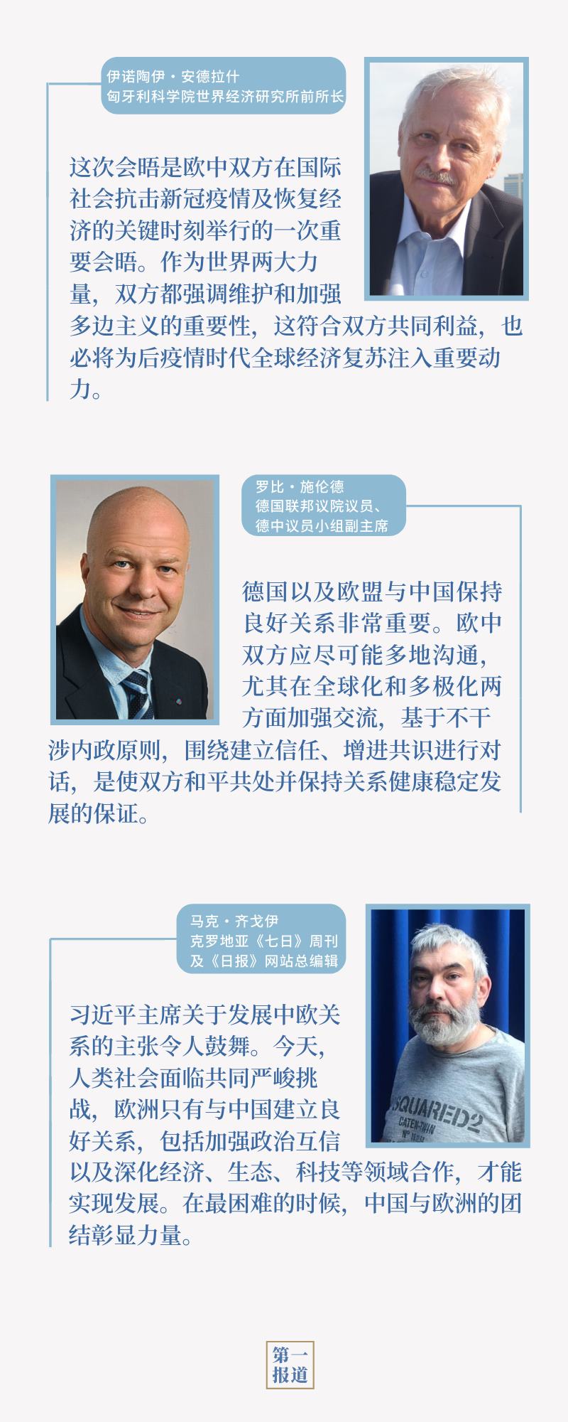 新冠疫情沖擊之下,世界變局加速演進(jìn),不穩(wěn)定不確定因素持續(xù)累積。中歐作為世界兩大力量、兩大市場、兩大文明,主張什么、反對什么、合作什么,具有世界意義。相互支持、團(tuán)結(jié)合作,中歐在推動(dòng)國際社會(huì)抗擊疫情、恢復(fù)經(jīng)濟(jì)、維護(hù)正義等方面大有可為。