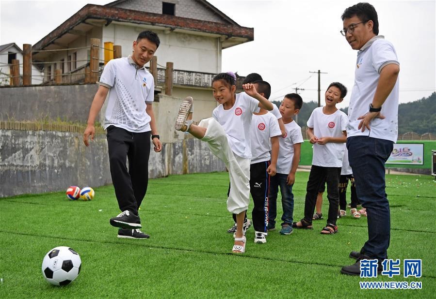在江西省貴溪市金屯鎮(zhèn)金屯村渡坊村小組,志愿者和留守兒童一起進(jìn)行體育活動(dòng)(5月27日攝)。新華社記者萬象攝