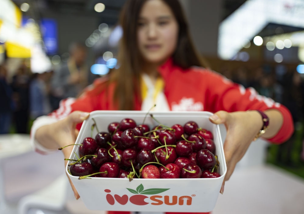 ▲第二屆進(jìn)博會上,工作人員在食品及農(nóng)產(chǎn)品展區(qū)展示智利車?yán)遄印?/p>