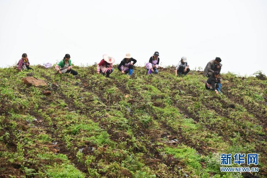 農(nóng)民在貴州省普安縣地瓜鎮(zhèn)屯上村的“扶貧茶園”里給茶苗除草(2019年7月7日攝)。當(dāng)?shù)氐牟鑸@栽種有浙江安吉黃杜村捐贈的白茶苗。新華社記者 楊文斌 攝