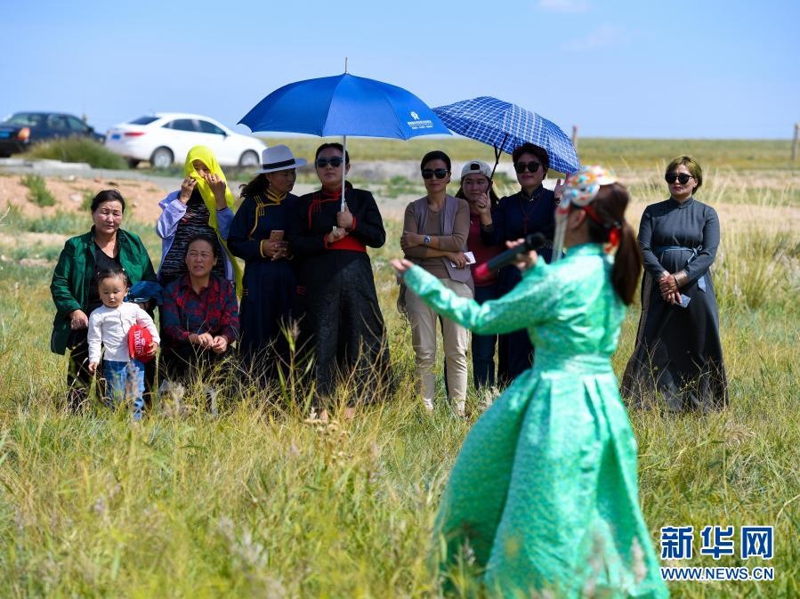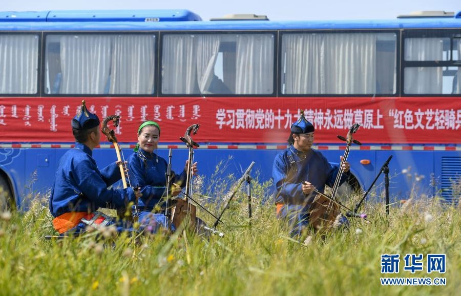 2018年9月13日,在內(nèi)蒙古自治區(qū)錫林郭勒盟鑲黃旗寶格達(dá)音高勒蘇木浩尼欽哈夏圖嘎查的一處草場,鑲黃旗烏蘭牧騎的隊員在為牧民表演文藝節(jié)目。新華社記者