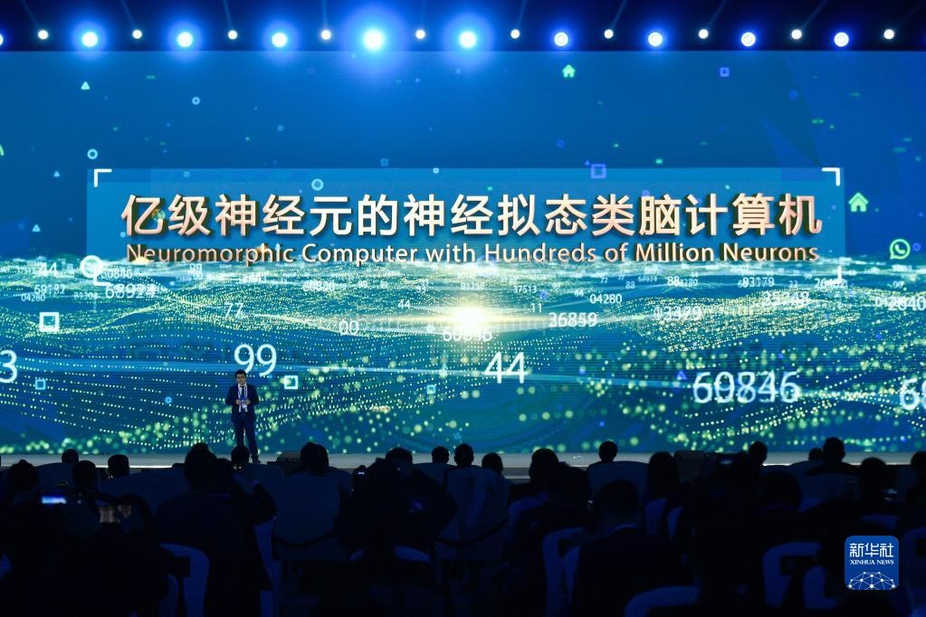浙江大學(xué)、之江實(shí)驗(yàn)室代表在“世界互聯(lián)網(wǎng)領(lǐng)先科技成果發(fā)布”活動(dòng)上介紹“億級(jí)神經(jīng)元的神經(jīng)擬態(tài)類(lèi)腦計(jì)算機(jī)”(2020年11月23日攝)。新華社記者 黃宗治 攝