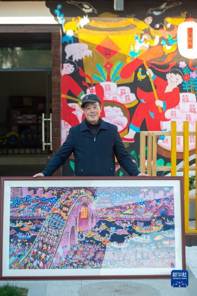 浙江省嘉興市秀洲區(qū)油車(chē)港鎮(zhèn)勝豐村村民張金泉與自己的畫(huà)作《國(guó)泰民安》合影(2020年12月15日攝)。新華社記者 江漢 攝