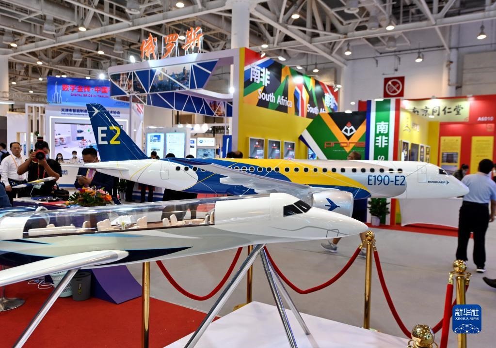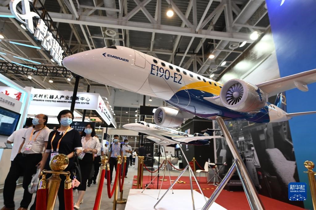 參觀者從2021金磚國家新工業(yè)革命展展出的飛機(jī)模型前走過(2021年9月8日攝)。新華社記者林善傳攝