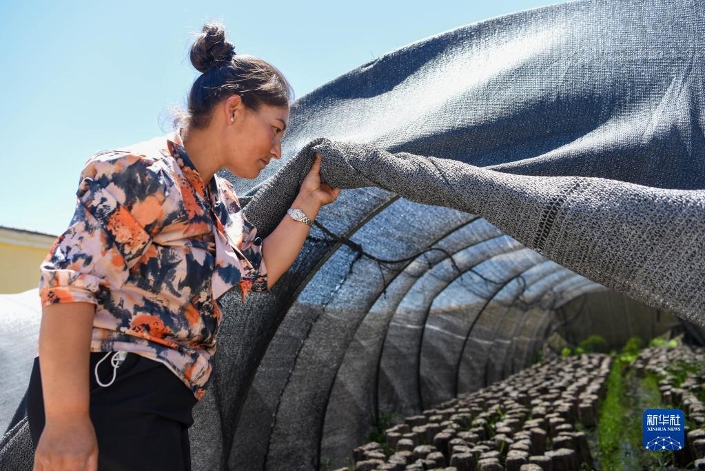 在新疆烏什縣依麻木鎮(zhèn),在新疆維吾爾自治區(qū)黨委組織部、老干部局駐托萬克麥蓋提村“訪民情惠民生聚民心”工作隊的幫助下,不少村民通過培植木耳增收致富(2022年6月7日攝)。新華社記者