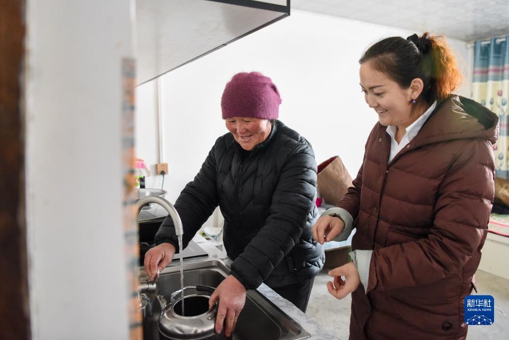 在新疆福海縣解特阿熱勒鎮(zhèn)京什開薩爾村,村干部(右)來到前不久剛接通自來水的村民家中了解水質情況(2021年11月25日攝)。新華社記者 丁磊