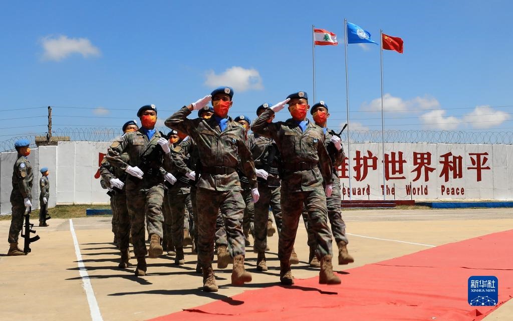 在黎巴嫩南部辛尼亞村的中國維和部隊(duì)營區(qū),中國維和部隊(duì)官兵在受勛后通過觀禮臺(tái)(2022年7月1日攝)。新華社記者 劉宗亞 攝