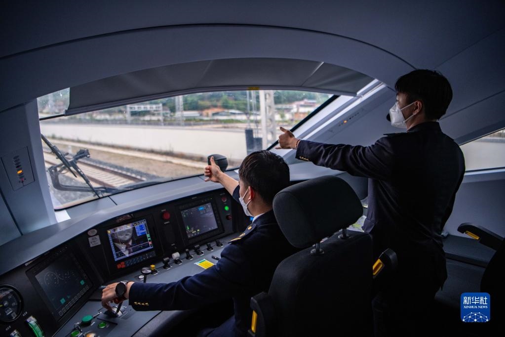 列車司機(jī)駕駛復(fù)興號(hào)列車行駛在中老鐵路上(2022年6月1日攝)。新華社記者 江文耀 攝