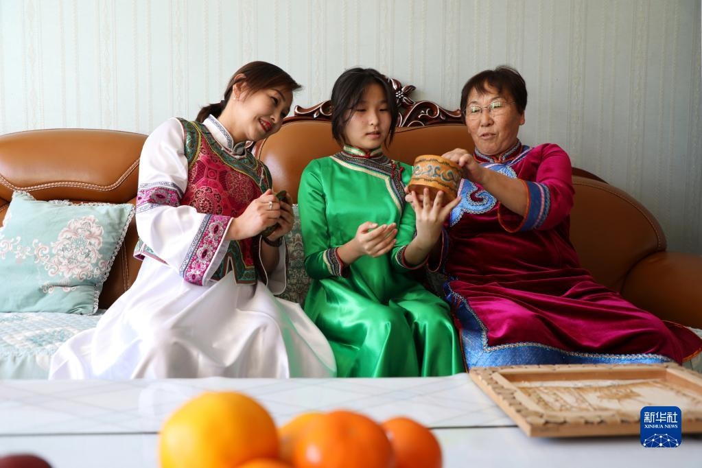 10月17日,內蒙古莫力達瓦達斡爾族自治旗布西社區(qū)居民杜文娟(左)和家人在一起。新華社記者 鄒儉樸 攝
