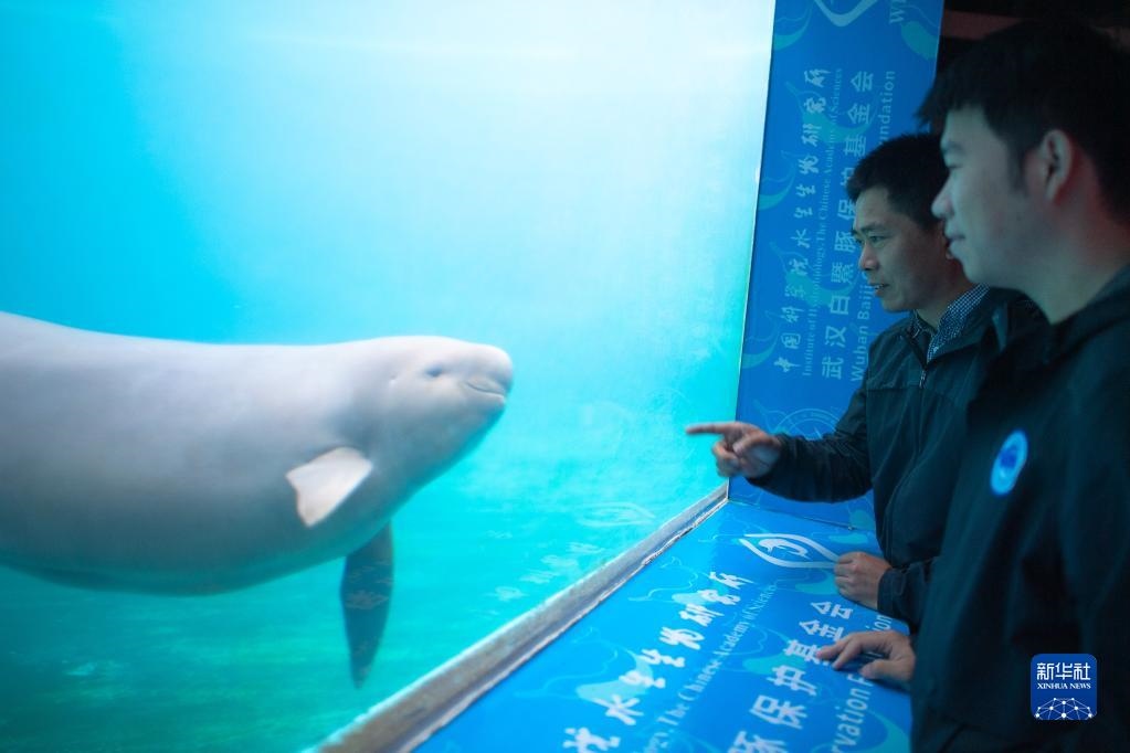 10月18日,在湖北武漢的中科院水生所白鱀豚館,長期從事長江江豚保護研究工作的郝玉江副研究員(左)在向學生講解江豚行為習慣。新華社發(fā)