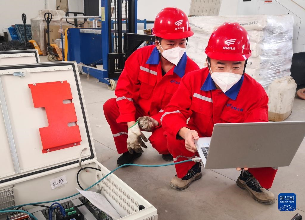 10月16日,在新疆烏魯木齊金風科技天翼達坂城試驗風電場,場長張新旺(右)和同事一起工作。新華社發(fā)(周凱 攝)