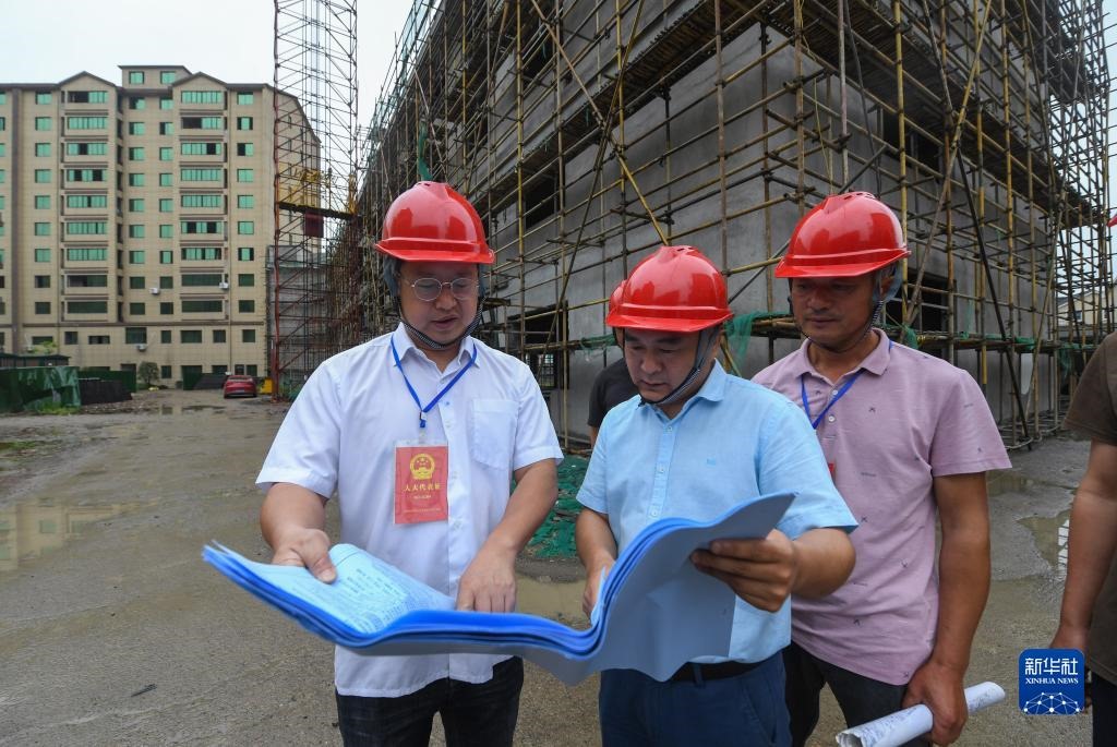 在浙江省湖州市吳興區(qū)東林鎮(zhèn)星火村,當(dāng)?shù)厝舜蟠砑按迕翊韺?duì)星火村農(nóng)民新村建設(shè)項(xiàng)目的施工進(jìn)展情況進(jìn)行監(jiān)督檢查(2021年6月2日攝)。新華社記者 徐昱 攝