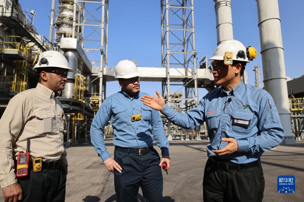 2022年11月27日,在沙特西部城市延布,中沙延布煉廠的員工在交流。新華社記者 王海洲 攝