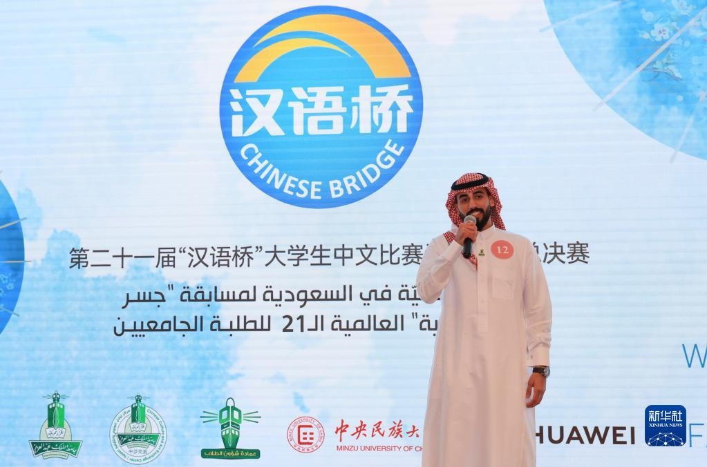 2022年7月20日,在沙特首都利雅得,第21屆“漢語橋”世界大學(xué)生中文比賽沙特賽區(qū)冠軍艾哈邁德·蘇萊曼在決賽中演講。新華社記者 王海洲 攝