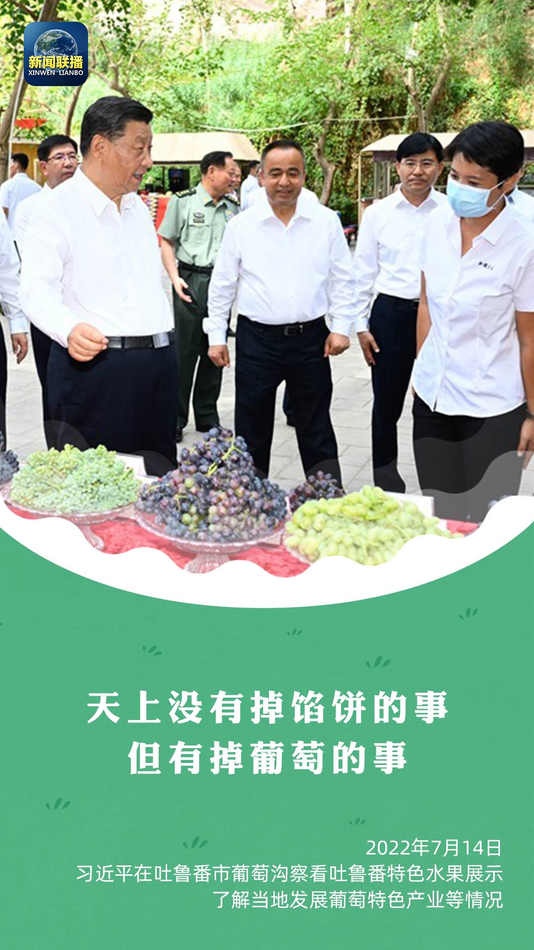 “多么富饒的一個(gè)地方,瓜果飄香。這是大自然的饋贈(zèng)?!笨倳涳L(fēng)趣地說(shuō),“天上沒(méi)有掉餡餅的事,但有掉葡萄的事。”總書記還強(qiáng)調(diào),要推動(dòng)文化和旅游融合發(fā)展,打造富民產(chǎn)業(yè)。