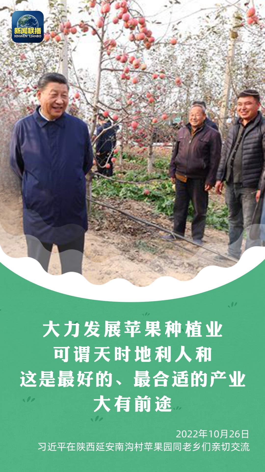 如今在延安,看到碩果累累的豐收景象,交通條件大為改善,發(fā)生了翻天覆地的變化。過(guò)去陜北老鄉(xiāng)們修梯田、種莊稼,面朝黃土背朝天,掄起老鋤頭干活,廣種薄收,十分辛苦,如今山坡上退耕還林種上了蘋果,老鄉(xiāng)們有工作、有穩(wěn)定收入,孩子有好的教育,老人都有醫(yī)保,生活越來(lái)越好??倳浾f(shuō),“從陜北的變化就可以看到中國(guó)的變化?!?/p>