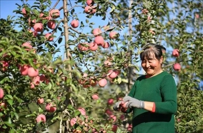 2022年10月,在陜西延安南溝村果園,習(xí)近平總書記同老鄉(xiāng)們親切交流,并采摘了一個(gè)紅紅的大蘋果。