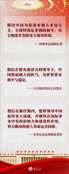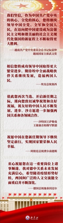 多國領(lǐng)導(dǎo)人在賀電賀函中表達(dá)他們對習(xí)近平全票當(dāng)選的祝賀與敬佩之情。