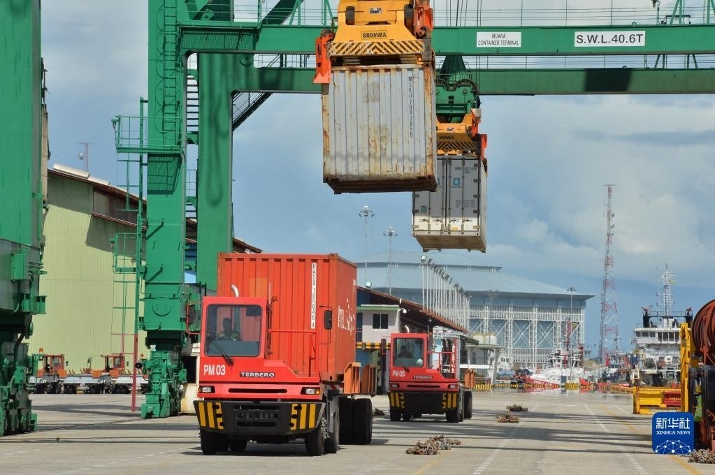 這是2022年1月1日拍攝的正在進(jìn)行集裝箱裝卸作業(yè)的文萊摩拉港碼頭。文萊摩拉港由中國和文萊合資企業(yè)——摩拉港有限公司運(yùn)營。2022年1月1日,區(qū)域全面經(jīng)濟(jì)伙伴關(guān)系協(xié)定(RCEP)生效實(shí)施。新華社發(fā)(杰弗里·黃攝)