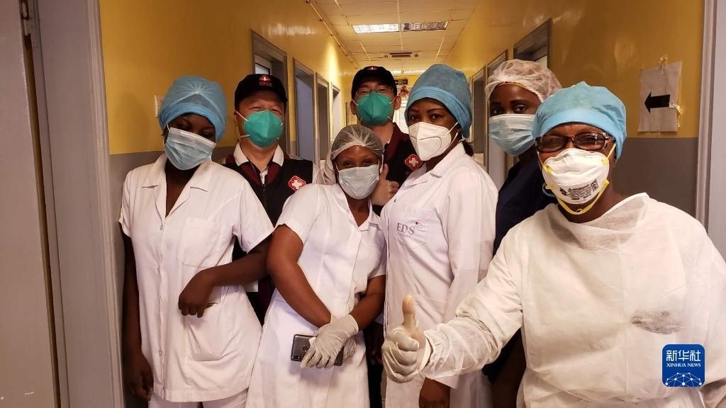 2020年5月26日,中國抗疫醫(yī)療專家組在剛果(布)首都布拉柴維爾指導(dǎo)新冠肺炎病房建設(shè)時(shí),與當(dāng)?shù)匾痪€醫(yī)務(wù)人員合影。新華社發(fā)