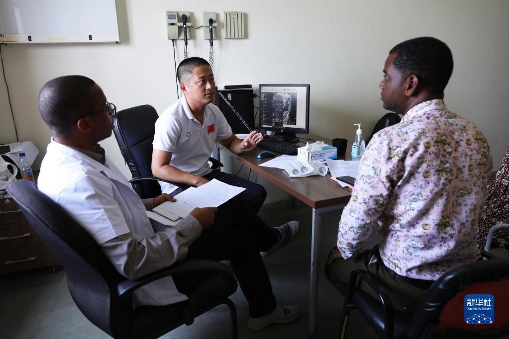 2023年2月22日,在坦桑尼亞桑給巴爾島納茲莫加醫(yī)院,中國援桑給巴爾醫(yī)療隊(duì)成員郭偉(左二)給病人看病。新華社記者 董江輝 攝