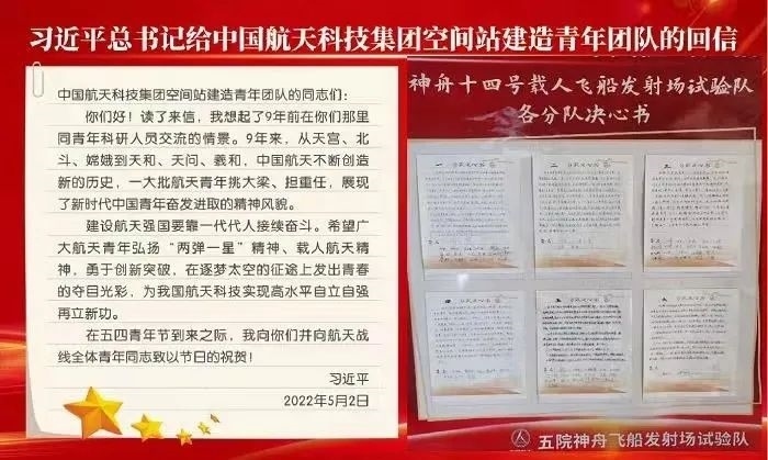 2022年5月2日,習(xí)近平總書(shū)記給中國(guó)航天科技集團(tuán)空間站建造青年團(tuán)隊(duì)回信,高度肯定航天青年,殷切期待青春奮斗。他強(qiáng)調(diào):“希望廣大航天青年弘揚(yáng)‘兩彈一星’精神、載人航天精神,勇于創(chuàng)新突破,在逐夢(mèng)太空的征途上發(fā)出青春的奪目光彩,為我國(guó)航天科技實(shí)現(xiàn)高水平自立自強(qiáng)再立新功。”一年來(lái),五院人持續(xù)學(xué)習(xí)重溫、堅(jiān)決貫徹落實(shí)習(xí)近平總書(shū)記重要回信精神和關(guān)于航天強(qiáng)國(guó)建設(shè)的重要指示批示精神,始終做到牢記囑托、感恩奮進(jìn),交出非凡“答卷”。