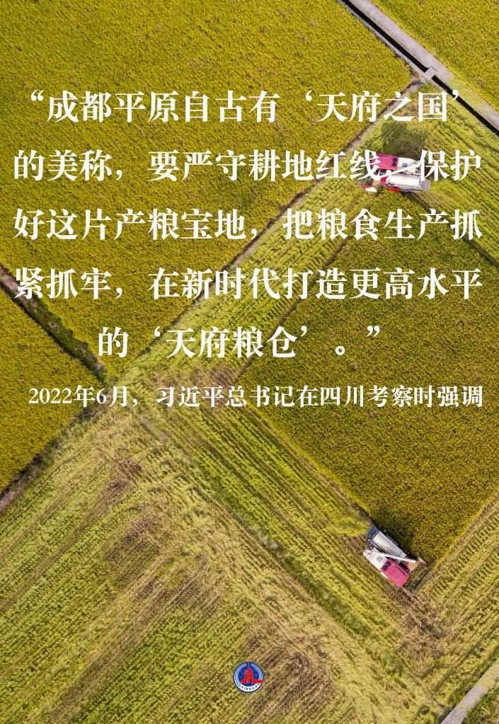 2022年6月,習(xí)近平總書記在四川考察時強調(diào),“成都平原自古有‘天府之國’的美稱,要嚴守耕地紅線,保護好這片產(chǎn)糧寶地,把糧食生產(chǎn)抓緊抓牢,在新時代打造更高水平的‘天府糧倉’”。