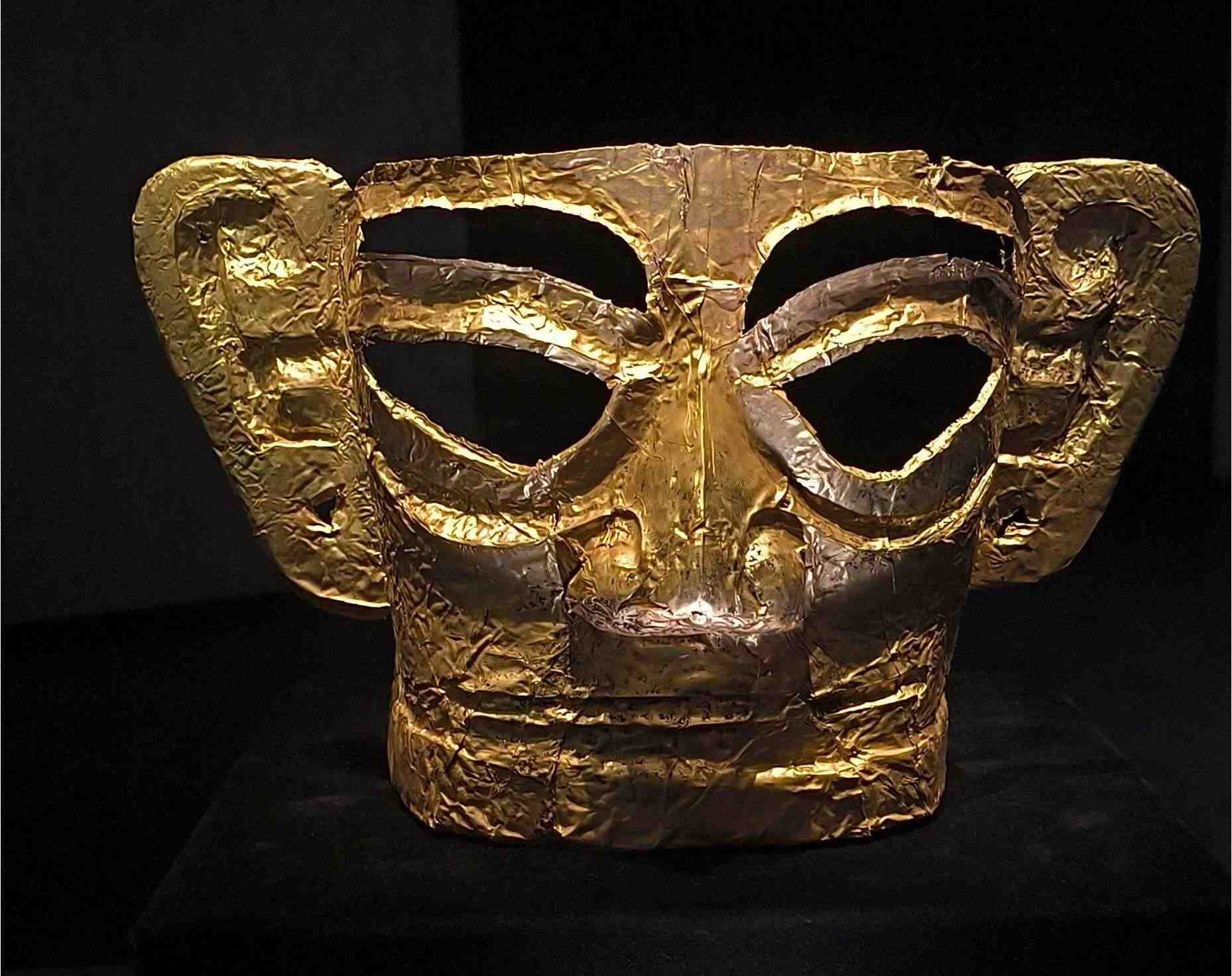 △三星堆博物館展出的金面罩。(總臺(tái)央視記者范凱拍攝)