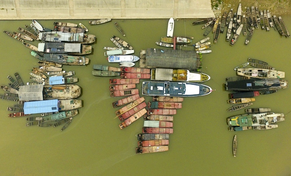 這是2019年12月17日在湖南常德漢壽縣蔣家嘴鎮(zhèn)拍攝的??吭诙赐ズ叺臐O船(無人機照片)。2020年1月1日零時起,長江流域332個自然保護(hù)區(qū)和水產(chǎn)種質(zhì)資源保護(hù)區(qū)全面禁止生產(chǎn)性捕撈。長江流域各地重點水域也相繼進(jìn)入為期十年的常年禁捕期。