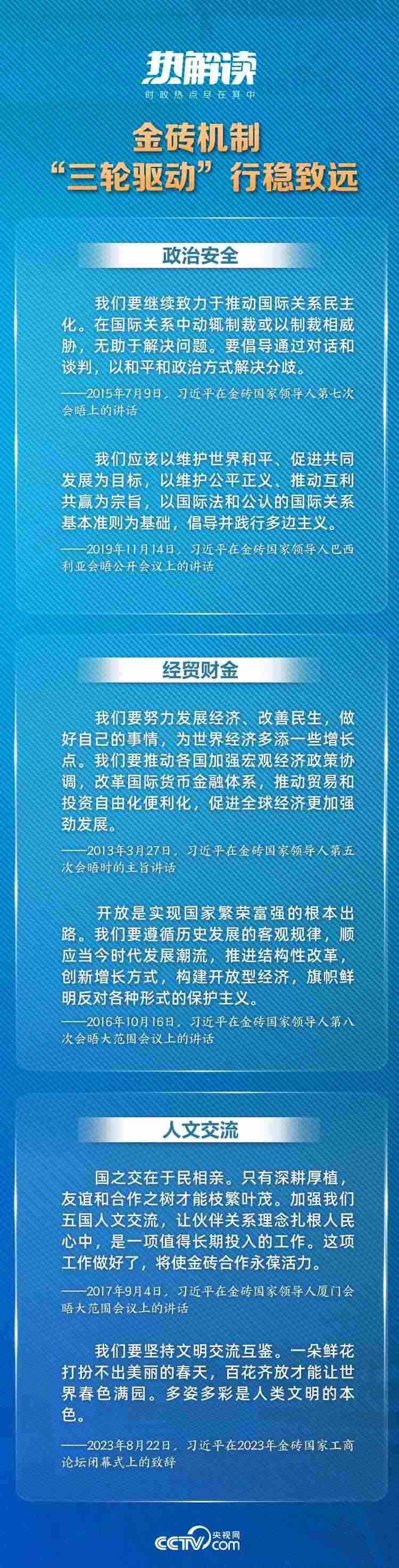 從字母組合的符號象征到一塊實打?qū)嵉摹敖鸫u”,回顧金磚合作機制走過的歷程,習(xí)近平主席倡導(dǎo)的“三輪驅(qū)動”合作架構(gòu)為金磚國家合作發(fā)展提供了可行有效的抓手。