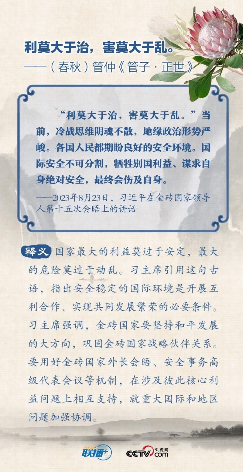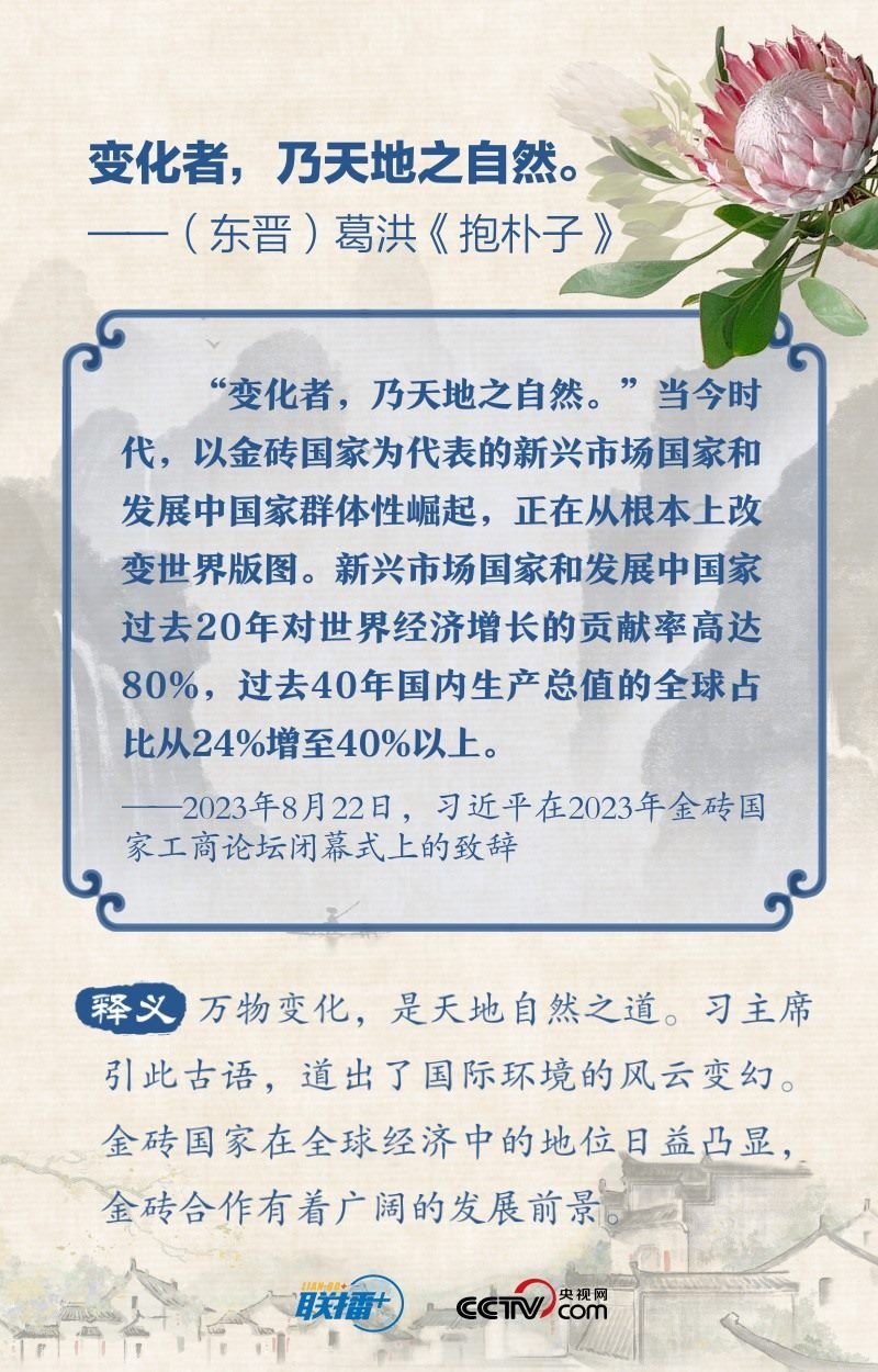 “順理而舉易為力,背時而動難為功”“變化者,乃天地之自然”“利莫大于治,害莫大于亂”…… 2023年的“金磚時間”里,習(xí)近平主席多次在講話中引經(jīng)據(jù)典,闡述金磚國家的合作與發(fā)展之道。央視網(wǎng)《聯(lián)播+》特擷取習(xí)主席用典金句,與您一起學(xué)習(xí)。