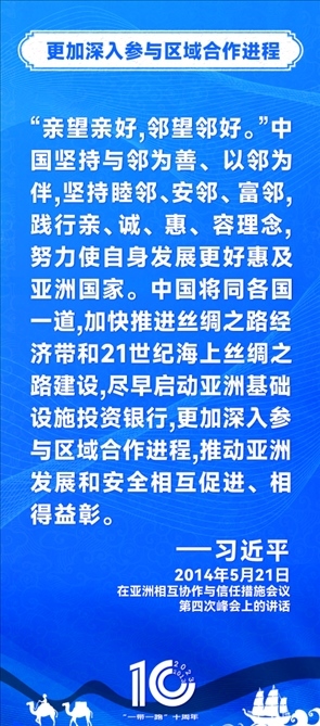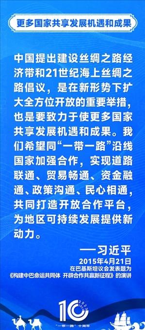 10年前,習(xí)近平主席提出共建“絲綢之路經(jīng)濟(jì)帶”和“21世紀(jì)海上絲綢之路”,即共建“一帶一路”倡議。過去10年來,習(xí)近平主席在多個場合發(fā)表講話和署名文章,為世界描繪了共建“一帶一路”互聯(lián)互通、合作共贏的宏偉藍(lán)圖。