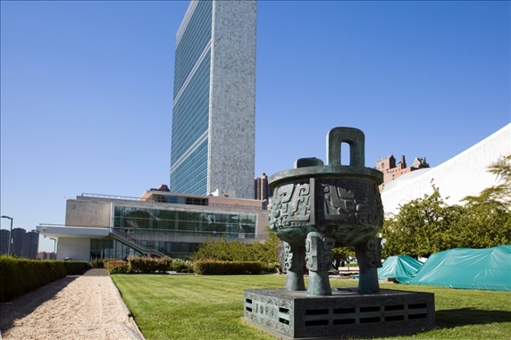 這是2015年9月15日在美國(guó)紐約聯(lián)合國(guó)總部拍攝的“世紀(jì)寶鼎”?!笆兰o(jì)寶鼎”是中國(guó)在1995年聯(lián)合國(guó)成立50周年之際,贈(zèng)送給聯(lián)合國(guó)的禮物。新華社記者 李木子 攝