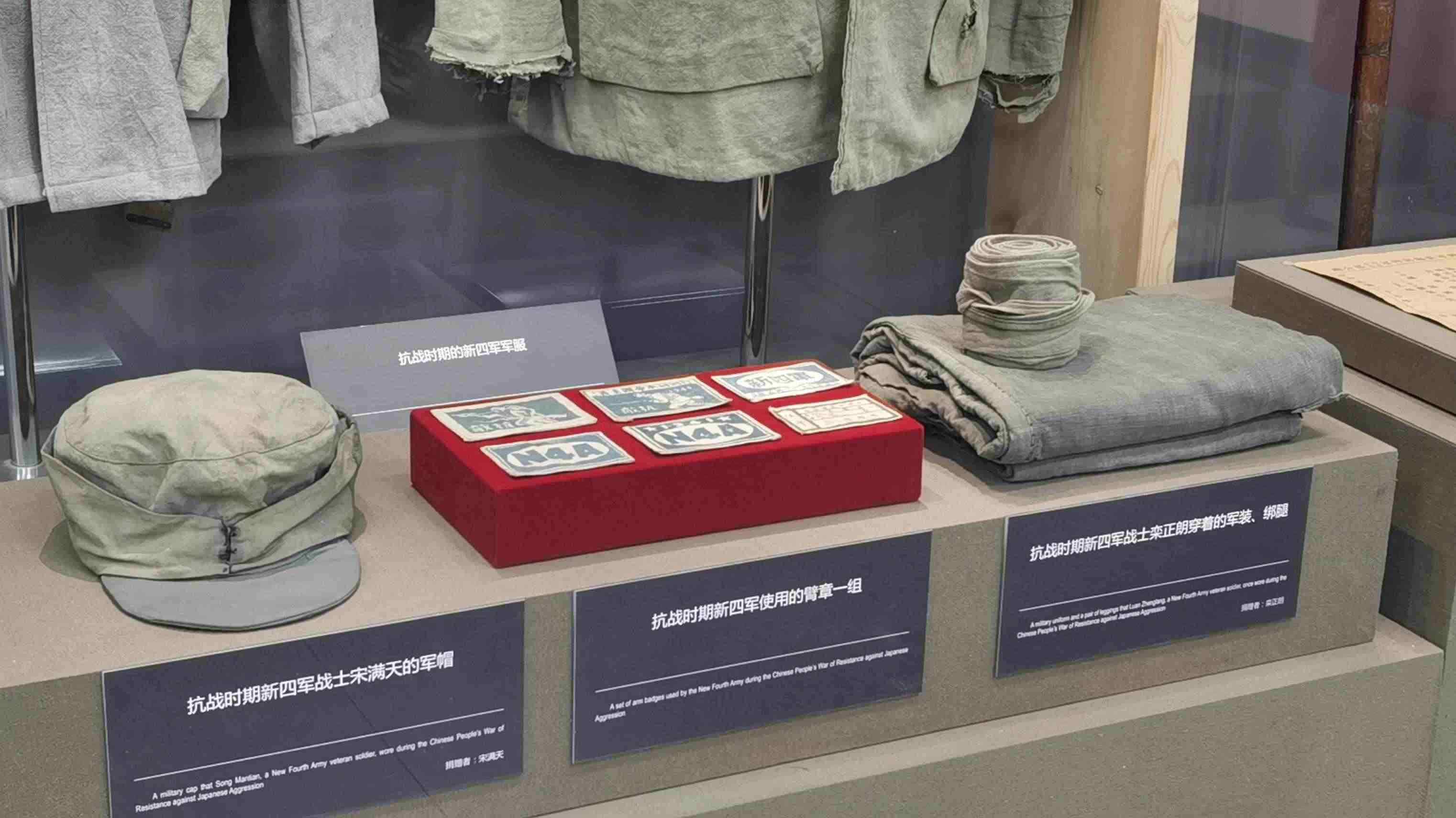 △抗戰(zhàn)時(shí)期新四軍使用的軍帽、臂章等。(總臺(tái)央視記者郭鴻拍攝)