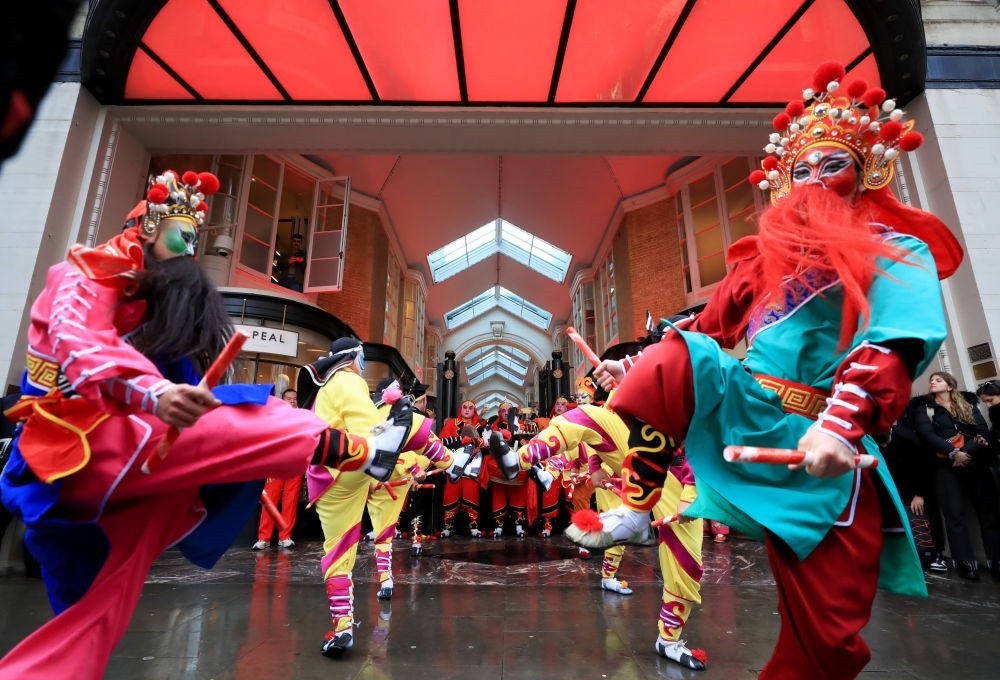 2024年2月10日,來(lái)自廣東普寧的英歌舞團(tuán)演員在英國(guó)倫敦伯靈頓拱廊街表演英歌舞。新華社記者 李穎 攝