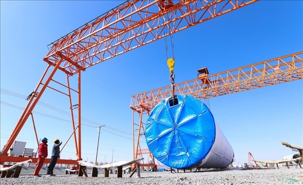 △ 2024年3月7日,甘肅省張掖市,工人們正在吊裝風(fēng)力發(fā)電機(jī)組塔筒,準(zhǔn)備運(yùn)往安裝現(xiàn)場(chǎng)。
