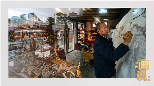 △安鄉(xiāng)潘氏藝術木雕傳承人潘能輝在繪制手稿。