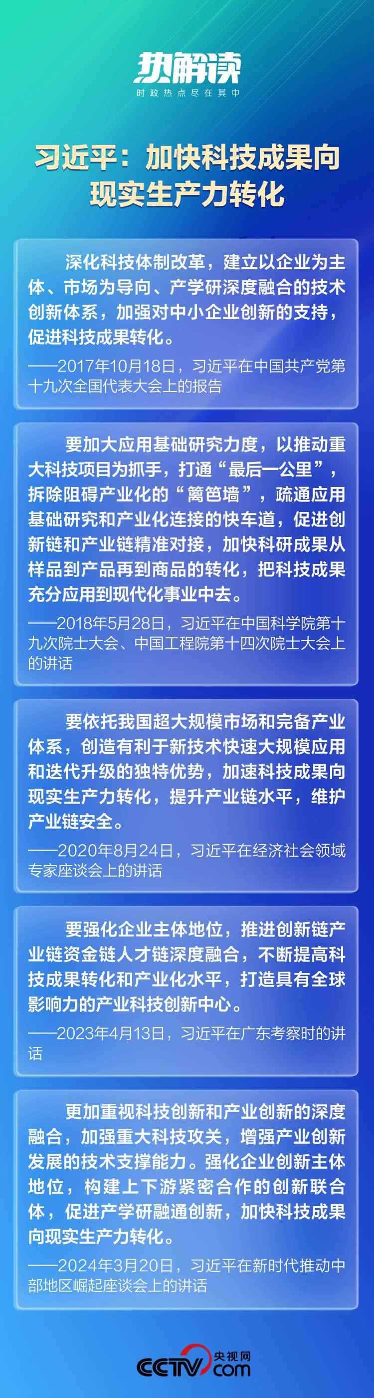 聽(tīng)取湖南省委和省政府的工作匯報(bào),總書(shū)記再提新質(zhì)生產(chǎn)力,同樣提到科技成果轉(zhuǎn)化問(wèn)題:“促進(jìn)創(chuàng)新鏈產(chǎn)業(yè)鏈資金鏈人才鏈深度融合,推動(dòng)科技成果加快轉(zhuǎn)化為現(xiàn)實(shí)生產(chǎn)力。”