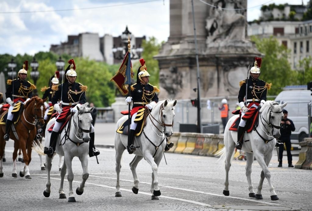 歡迎儀式后,習(xí)近平和夫人彭麗媛在共和國衛(wèi)隊148名騎兵組成的禮兵馬隊和摩托車隊護(hù)衛(wèi)下,乘車前往愛麗舍宮。