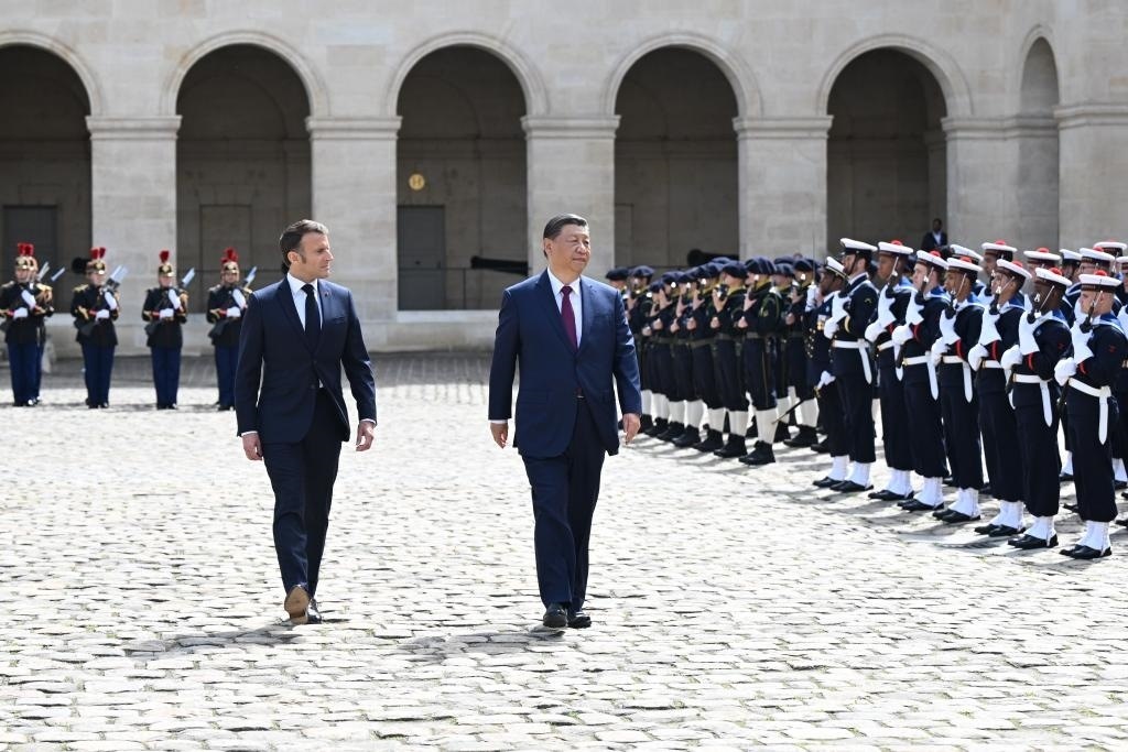 當(dāng)天下午,習(xí)近平在巴黎出席馬克龍舉行的隆重盛大歡迎儀式。兩國元首檢閱法蘭西共和國衛(wèi)隊和陸??杖妰x仗隊,并觀看分列式。